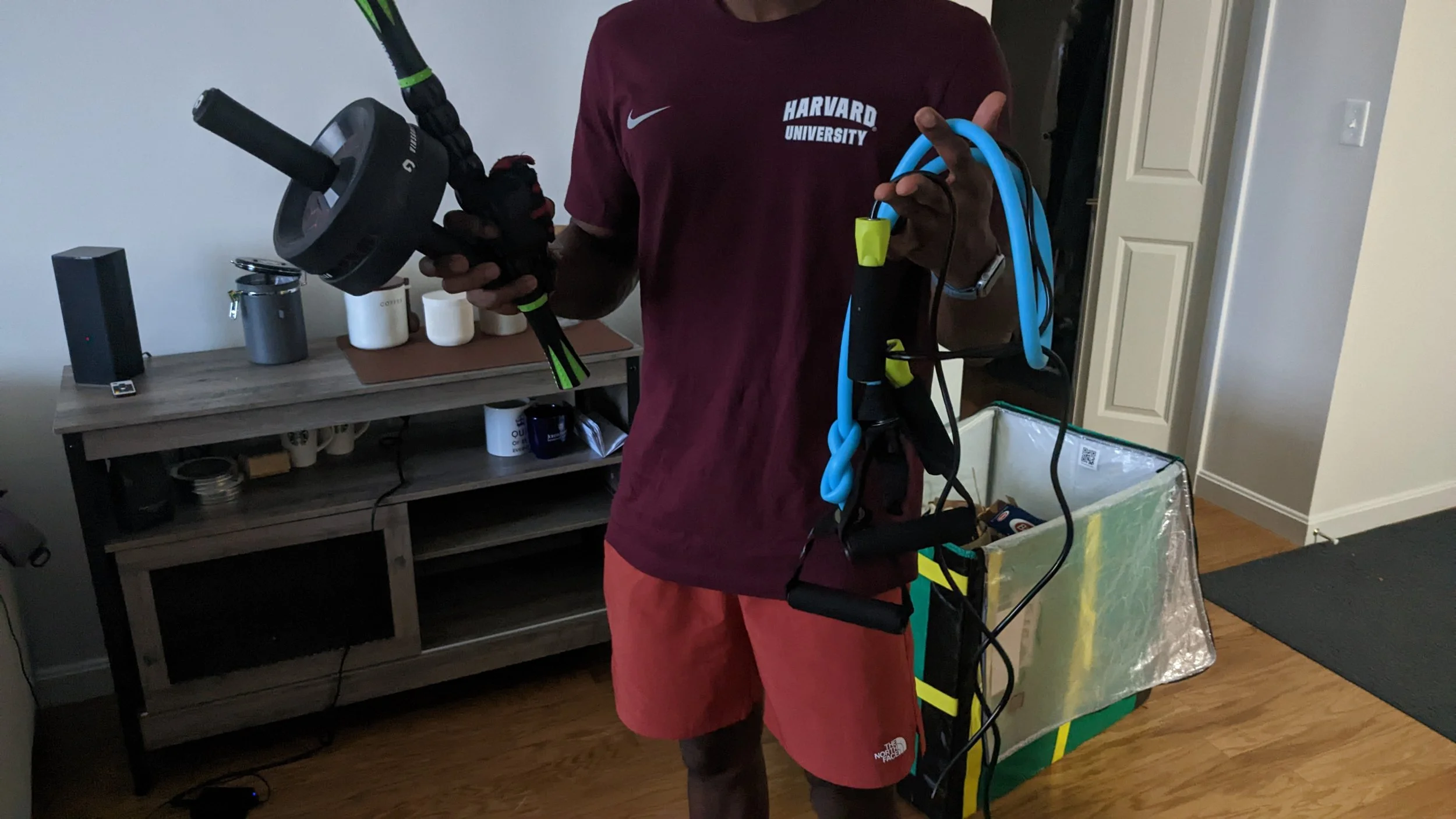 The gear it holds can consist of an ab roller, massage stick, and jump rope that can all be assembled with interchangeable handles